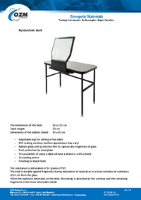 Pyrotechnic desk The dimensions of the desk: Table height: Dimensions of the ballistic shield: − − − − − − − 60 x 120 cm 83 cm 60 x 60 cm Adjustable legs for setting of the table ESD coating…